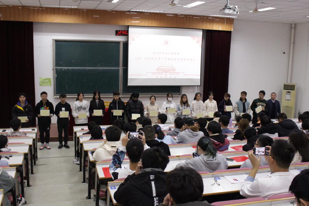 2021-2022学年第一学期业余党校结业典礼在13号楼报告厅举行。学院党委副书记邓琨老师出席并讲话,学工办张圣晨老师、培训班学员参加典礼。