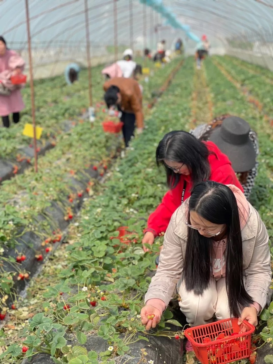 王店镇建林村作为第一批国家森林乡村,绿荫葱葱,景色宜人,其中建林村范围内的聚宝湾梅园占地百亩,植梅20多个品种,一万多株白梅、红梅化成一片片梅海,真可谓“众芳摇落独暄妍,占尽风情向小园”,与江南水乡相得益彰。学院的女教师穿梭在万株梅树林中,在白梅、红梅的衬托下,定格成春天里最动人的春色。午餐后,大家一同来到草莓园采摘草莓,陶醉在迷人风景的同时,感受大自然的清新与质朴,体验农家的悠闲生活与农业劳作的乐趣。