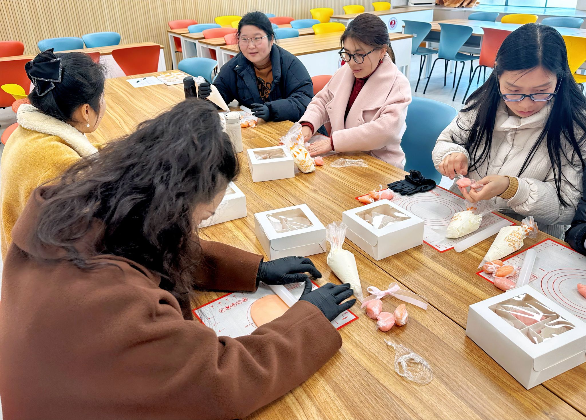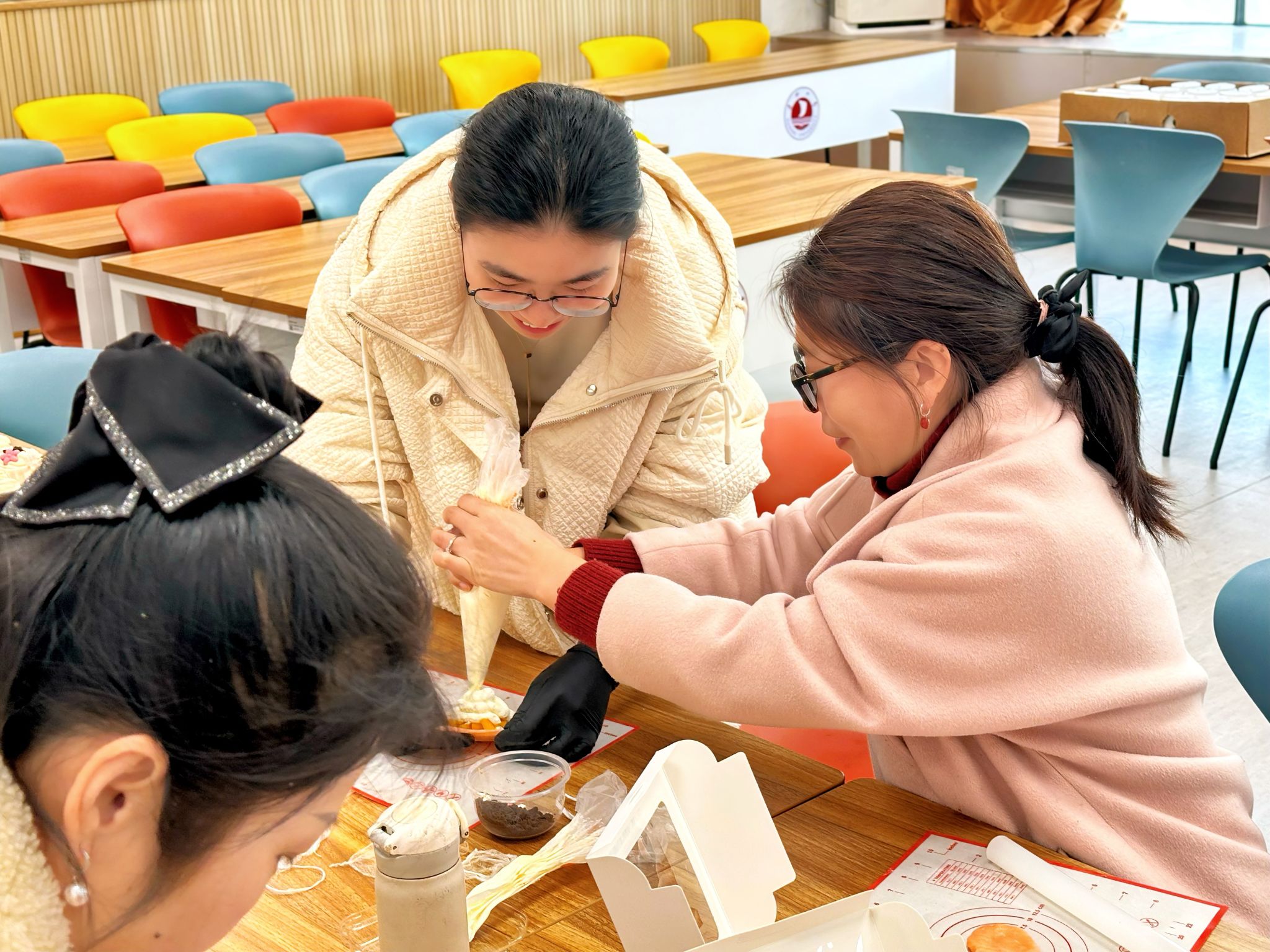 活动现场洋溢着浓厚的节日气息。两院工作人员早早布置了现场、准备好材料,女教职员工们热情高涨,纷纷挽起袖子“一较高下”。在纸杯蛋糕装饰环节,老师们手持奶油裱花袋,小心翼翼地挤出细腻的奶油花,每一道弧线、每一个褶皱都饱含着用心。在雪媚娘的制作过程中,经过烘焙老师的指导,大家可以熟练地制作糯米皮、调制内馅,手法娴熟而利落。大家在欢声笑语中分享彼此在工作中的点滴成就和生活中的美好瞬间。活动还贴心地为大家设置了茶歇区,活动现场充满欢声笑语。
