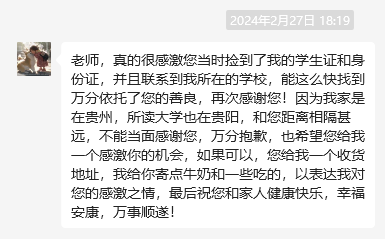“一站式”学生社区在短时间内,通过学校联系到本人的行为深表感激。为了尽快将证件交还给失主,学生社区决定以快递形式将遗失证件寄送至贵州财经大学。